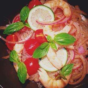 將所有配料倒入一個大容器,加入醬汁,擠入半顆青檸汁,最後撒上九層塔,成盤吧。
