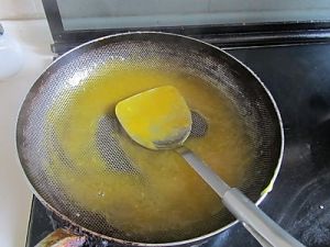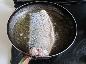 烧热油锅,将鱼皮表面朝上下入油锅;