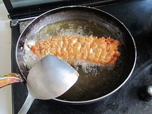 待鱼肉炸熟后且表面层金黄色后捞出控油;