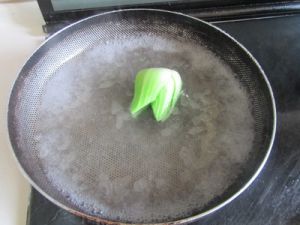 用油盐水把小塘菜飞水,捞起沥干水分待用;