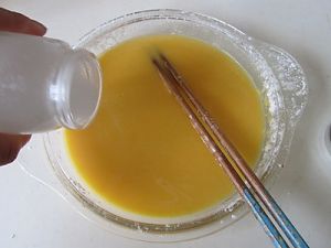 在橙汁中加入的盐和吉士粉, 搅拌均匀;