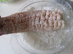 在腌好的鱼的表面拍上一层薄薄的生粉;