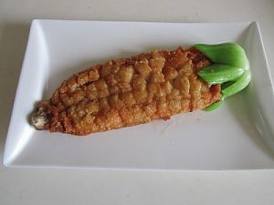 炸好后摆放在盘中,把飞了水的小塘菜放到靠近鱼尾处的鱼肉上;