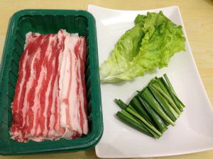 五花肉片(通常超市都有这样的切片包装,没有的话就买五花肉回来自己动手切片了哈),韭菜一小段,生菜叶