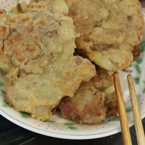 待热油后,将混合物倒入,用锅铲把它铺平成饼状