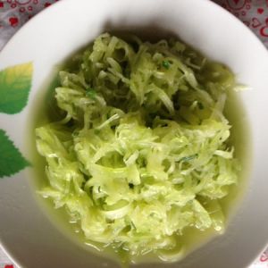 莴笋切丝,放盐腌一小时。(刀工还行吧!莴笋头可以做蛋汤,一菜两吃。)
