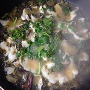加入鱼片,撒上葱花放入香菜,美味的鱼火锅大功告成