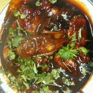 倒入可乐,淹没过鸡翅,放入2汤勺老抽,八椒,还有刚才不让你们倒掉的那一点腌制过的汁。大火烧开后,转小火慢慢收汁!要有耐心,勿心急。:-P