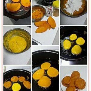 把南瓜泥分次放入平底锅内,炸至金黄色出锅即可。