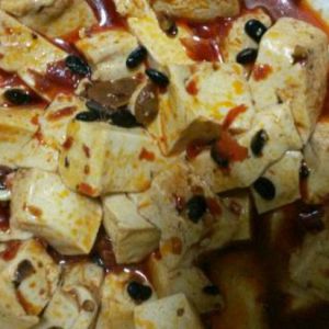 豆腐切块儿,油烧热后放入豆豉,豆瓣酱,倒入豆腐炒匀后加入水没过豆腐。