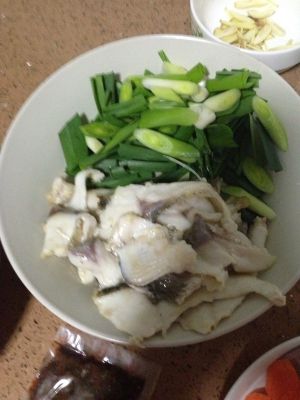鱼片好后用少量盐和酒腌制,取鸡蛋清一个备用。腌制等待时,姜蒜洗净切片,蒜苗斜刀切段。