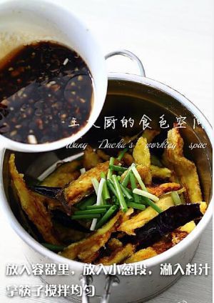 料汁和茄子充分搅拌均匀,喜欢吃辣的可以放入辣椒或者小米椒