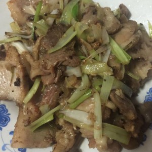 放蒜酱、盐、花椒粉、味精,再少放一点醋,调料和肉翻炒均匀即可