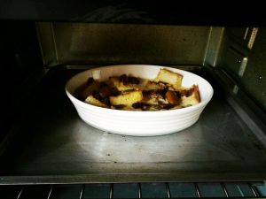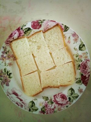 一片吐司,切成小块,放入烤箱,烤5分钟