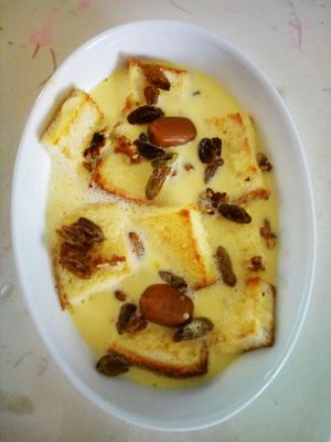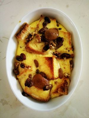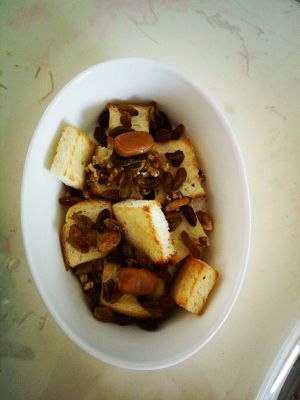 面包烤好,放入烤盘里,加入葡萄干核桃仁,我还加了两颗怡口莲