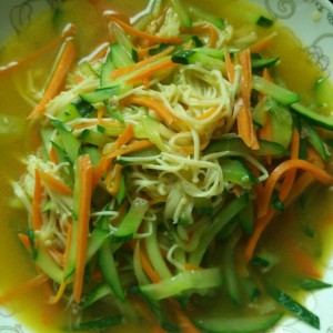 加入黄瓜,炒几分钟后加点酱油调色,放水煮几分钟,金针菇会出水,不用放太多,煮几分钟,加味精出锅