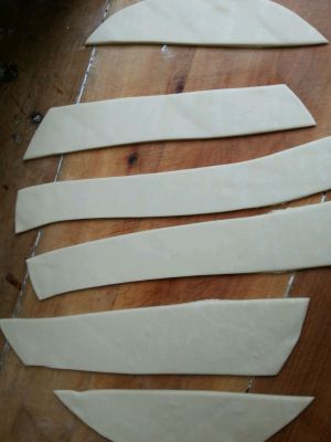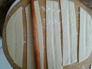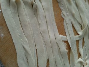 兴好的面饼切宽条,老妈要吃薄点的,所以我总是分两个面团。老妈的擀的薄些,并且在面条上用擀杖压个印。