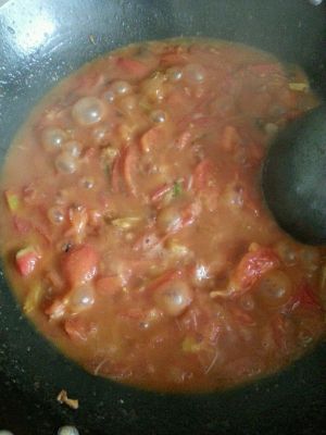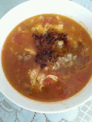 一直熬到西红柿出很多的汁水后加水,加的水量要够一人一碗。人多就多切几个西红柿,不然水太多不好吃啊!