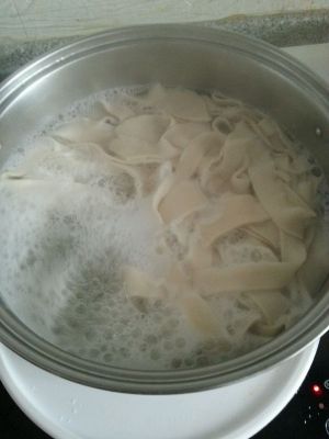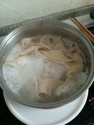 我的扯得厚些,水开后要煮4-5分钟,我喜欢吃硬的,煮熟就行。其实儿子也爱吃硬的,老妈怕他不消化不让他吃我的