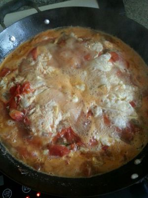 爆香葱姜,倒入西红柿翻炒。我家常备岐山臊子,可以加一些进去炒,也可以什么都不加