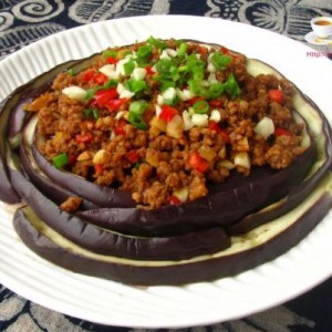 将煮好的肉末汁淋在摆蒸好的茄子上;