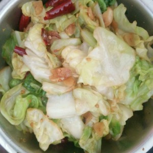 锅里热油,先炸干辣椒,再把葱蒜姜爆炒,最后把圆白菜放锅里加平时用的调料爆炒。爆炒时一定把火弄大。