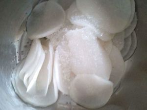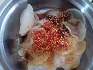萝卜片放一深钵里,放1勺盐拌匀腌制半小时,萝卜片出水并透明,淘洗干净挤干水份