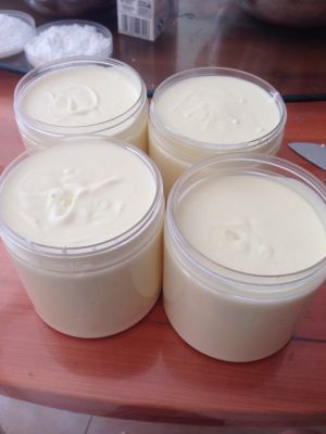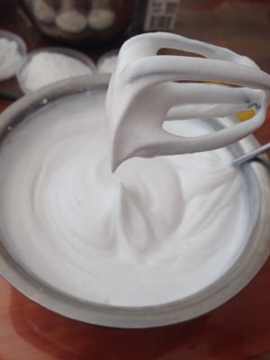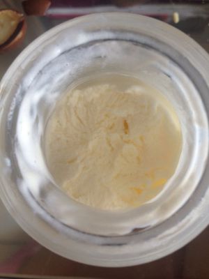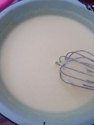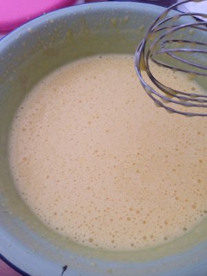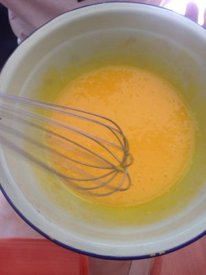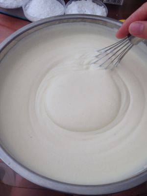 把凉好的蛋黄牛奶液沿着盆子慢慢倒进奶油里,边倒边搅拌