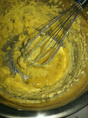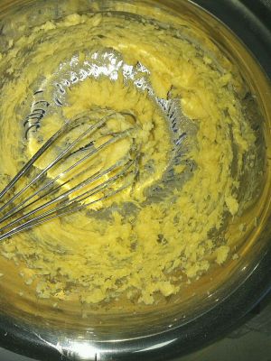 蛋液打散分三次,打入黄油内。每一次打到蛋液和奶油充分融合,再加入蛋液搅打。
