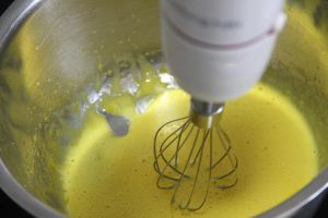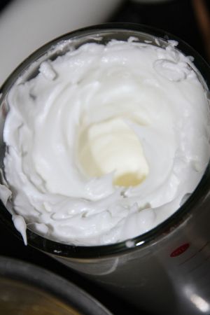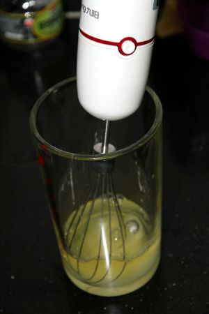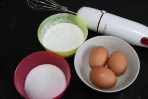 玻璃杯里放入蛋清及剩下的白糖(玻璃杯内要保证无油无水);
