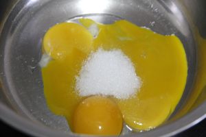蛋白和蛋黄分别放在无油无水的碗里;蛋黄加10g白糖;