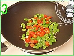 热锅少油爆香蒜末,倒入蚕豆米、圣女果翻炒1-2分钟;