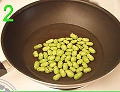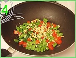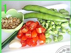 剥开蚕豆荚,取出蚕豆米,剥掉蚕豆外的豆衣,圣女果切小块,松子小火炒熟;