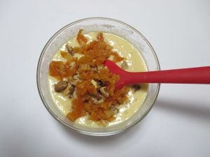 加入切碎的糖渍橙皮和核桃仁小丁混合均匀。