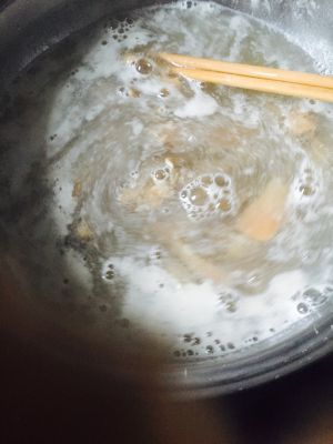 河蚌买回家后,用盐洗干净,切小段,放水里煮一遍加黄酒,锅盖开着~~沸腾后,过凉水