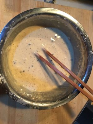 调面糊,我加了一小勺子白糖,5勺盐,适当的鸡精,胡椒粉,加入青花椒粒,