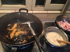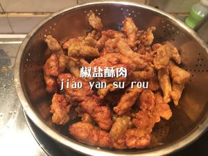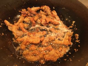 锅里面倒入小锅油,火调制微火,放入一些裹好的肉条,炸,炸至金黄色!至少要5分钟左右,