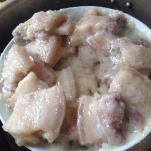 然后就把肉放进准备好的糯米粉里面拌匀两面都沾到码到碗里