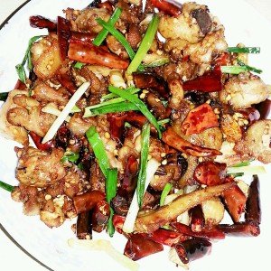 热锅入油小火煸香蒜瓣、姜丝、干辣椒节,倒入炸好的鸡块翻炒几下、放入葱段、少许盐和鸡精、落少许生粉水翻炒几下即可。