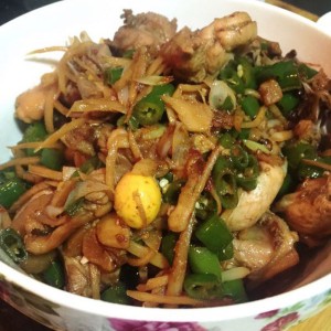 加入仔姜丝辣椒粒、大葱,大火炒几分钟,加水,视鸡肉多少加入适量水,大火烧开,转小火烧,约10-15分钟。