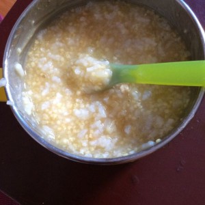把鸡肉泥和花菜和米一起加入适量水。放到压力锅按八宝粥按钮就可以了。