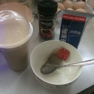 烧开水泡茶包,把咖啡粉也倒进去冲