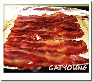 培根用红酒、冰糖腌制一小时后,上烤箱,以180度的火烤8分钟