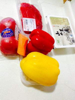 部分食材!豆腐用一半、红黄椒各1/4个。