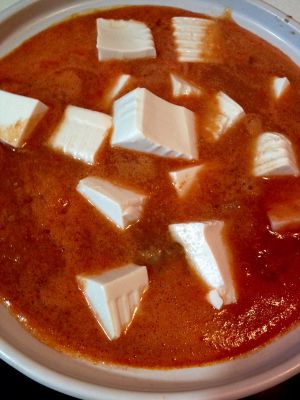 开大火、下入豆腐,再开锅2~3分钟至豆腐热透。