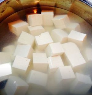 豆腐冲洗、切好,泡盐水里、去腥防碎!