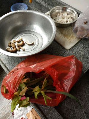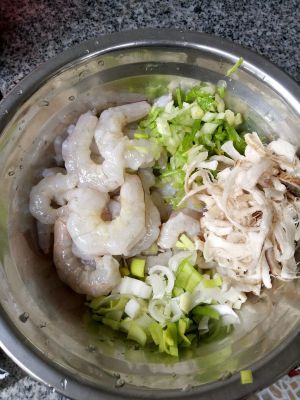 虾去壳,香菇棒手撕一下,芹菜洗净去叶