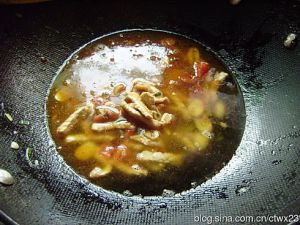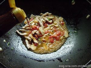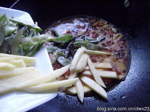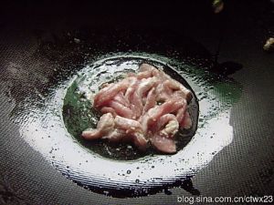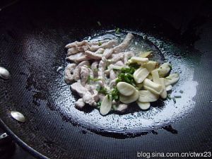 煸炒至肉丝干爽,加入葱花姜片大蒜片煸炒