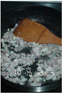 用余油煸炒洋葱丁至身软,色透明,盛出备用。