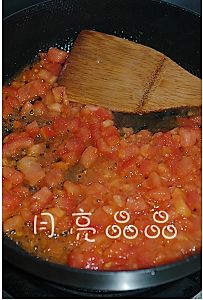 倒入番茄丁,加一小勺白糖煸炒至出沙(加白糖一起煸炒可以让番茄味道更浓厚)。